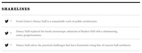 而如果你分享《洛杉矶时报》网站的文章,你再也不用担心如何绞尽脑汁写一段提要、或者苦苦思索如何填满微博输入框里的140个字的空白了——因为全新改版的《洛杉矶时报》官方网站做了一个决定,在其发表的每篇文章开头辟出一块,提供由编辑预先撰写的3-4条一句话分享内容(格式就是一条未发布的Twitter贴子),用户可以选择合自己心意的任意一条,直接分享至twitter。